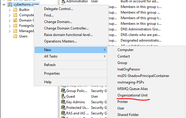 To create Organizational Units, right-click on our "cyberhorro" domain, go to "New," and you will find the option for "Organization Unit." Select it to initiate the creation process.
