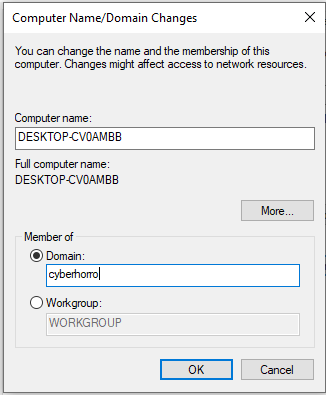 Scroll down until you find "System protection" or "Advanced system settings," then click on either one to open up system properties. Click on "Computer Name" and then click on "Change." A dialog box will appear where you can change your client machine's membership from workgroup to domain. In the provided box, enter the name of the domain you want it to join, in our case, it is "cyberhorro."
