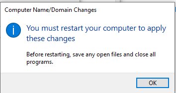 Once the process is completed, your client machine will have joined the domain and will be under the control of DC1. It will prompt you to restart for the changes to take effect.