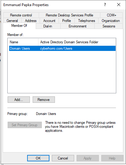 After creating the new user, double-click on the user to access its properties. Navigate to the "Member Of" tab to view the groups the user belongs to. In this instance, the user I created belongs to the "Domain Users" group.