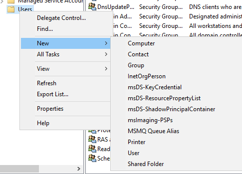 By right-clicking on "Users," navigating to "New," you can create various entities such as groups, computers, contacts, and more.