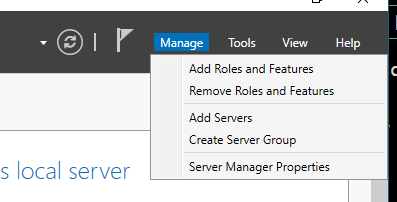 Open "Server Manager" on DC1 and navigate to "Manage" and select "Add Roles and Features."