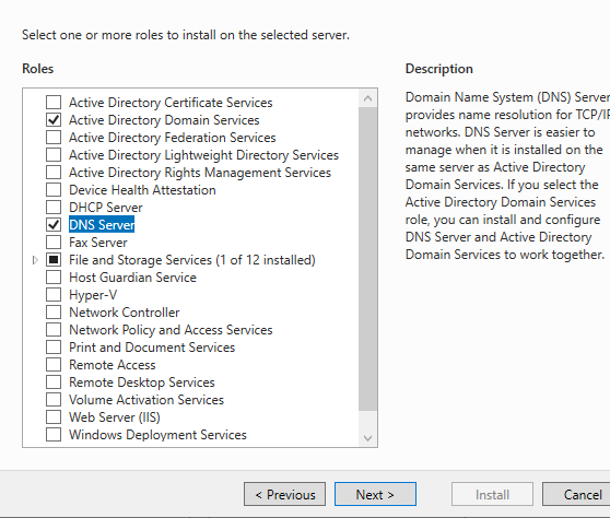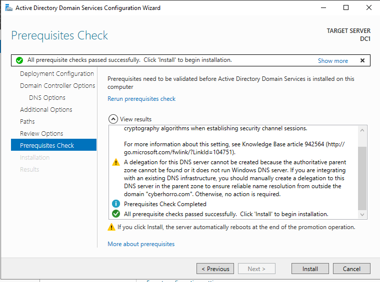 Proceed through the wizard, selecting the default options or configuring as needed. Complete the wizard and allow the roles to be installed on DC1.