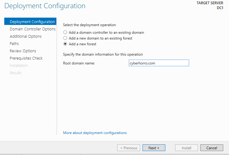 Choose "Add a new forest" since we are establishing a new environment from scratch.