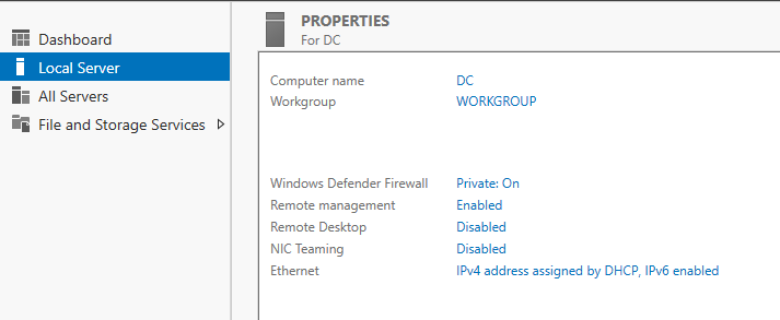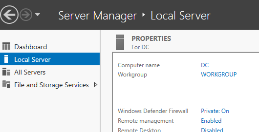 After installing Server 2019 and Windows 10 on VirtualBox, log in to your Server 2019. Navigate to Server Manager >> Local Server to rename your server to DC1 (Domain Controller 1).