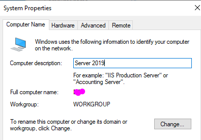 I utilized 'Server 2019' as my computer description and clicked on the "Change" button.