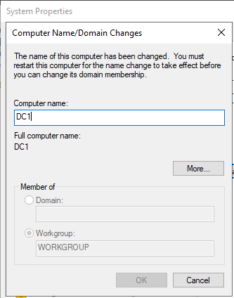 I set the Computer name to DC1 and clicked "OK," opting to restart later to modify the IP address before implementing the changes.