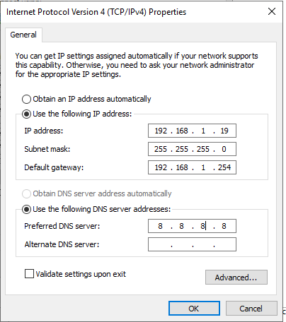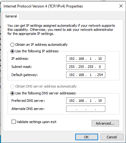 NOTE: I have set my preferred DNS server address to the IP address of my Server 2019 (DC1). This choice aligns with my intention to add specific roles on the server, including, but not limited to,"DNS" and "Active Directory."