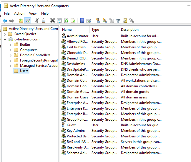 Following these steps, you should be able to view your domain, which is cyberhorro.com. Expand it, and click on "Users" to access and manage all the built-in accounts.
