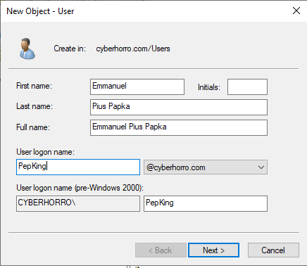 A dialog box will appear for you to input your details; I used my full name, as shown in the image below. Click "Next" to proceed.