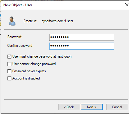 Set a password following best practices, click "Next," and then "Finish" to complete the creation of your new user.