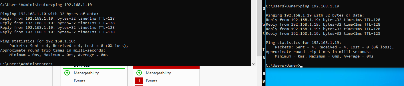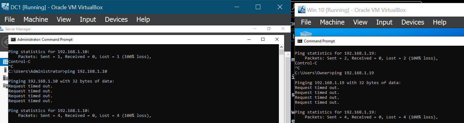 After successfully configuring the setup as described, I attempted to ping both Windows 10 and Server 2019, but unfortunately, neither machine responded.