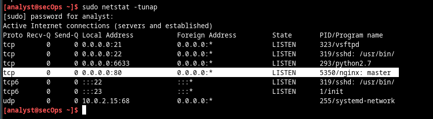 I used netstat with the –tunap options to adjust the output of netstat. Notice that netstat allows multiple options to be grouped together under the same “-“ sign.