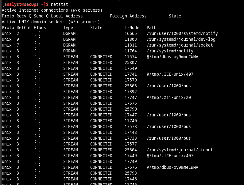 As mentioned before, servers are essentially programs, often started by the system itself at boot time. The task performed by a server is called a service. In such fashion, a web server provides web services. The netstat command is a great tool to help identify the network servers running on a computer. The power of netstat lies on its ability to display network connections. Output maybe different depending on the number of open network connections on your VM.
