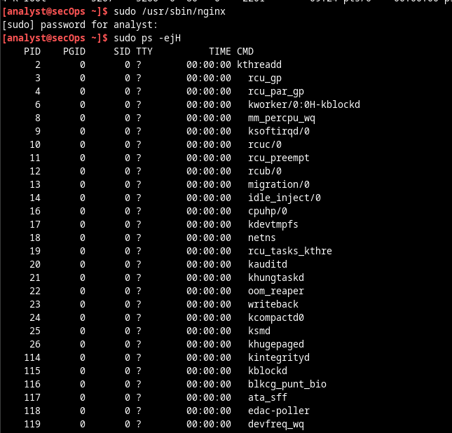 In Linux, programs can also call other programs. The ps command can also be used to display such process hierarchy. I used –ejH options to display the currently running process tree after starting the nginx webserver with elevated privileges