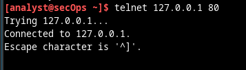 In Part 1, nginx was found to be running and assigned to port 80 TCP. Although a quick internet search revealed that nginx is a lightweight web server, how would an analyst be sure of that? What if an attacker changed the name of a malware program to nginx, just to make it look like the popular webserver? I used telnet to connect to the local host on port 80 TCP: