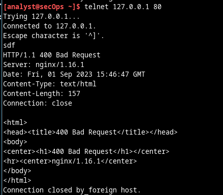 Thanks to the Telnet protocol, a clear text TCP connection was established, by the Telnet client, directly to the nginx server, listening on 127.0.0.1 port 80 TCP. This connection allows us to send data directly to the server. Because nginx is a web server, it does not understand the sequence of random letters sent to it and returns an error in the format of a web page.