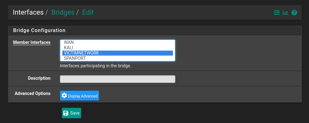 Note: Ensure that 'Adapter 1' on your Kali machine, or any testing machine you are using, is attached to the same 'internal network' and 'LAN' as 'Adapter 2' on your pfSense.