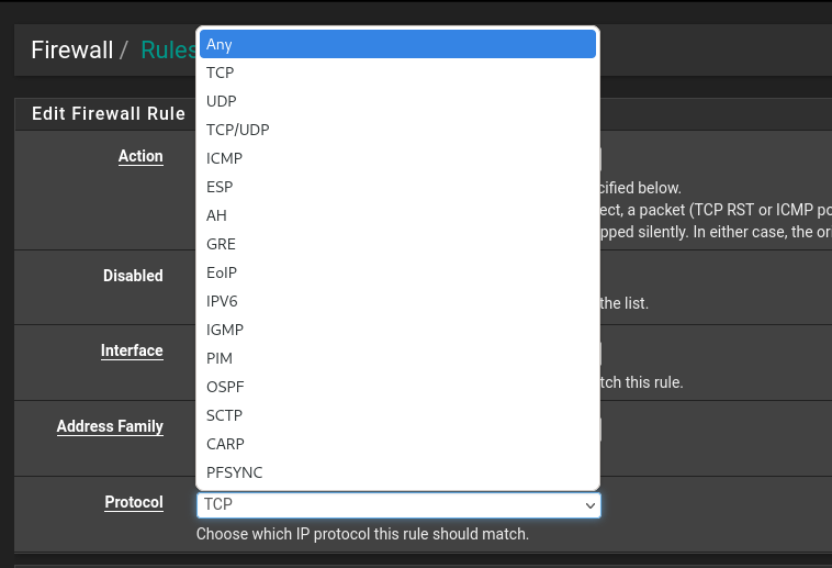 Go to "Firewall" and select "Rules." Click on "Add" to add a new rule to the end of the list. Navigate to the "Protocol" section and change it from TCP to "Any." Click "Save" and then apply the changes to implement the new firewall rule.