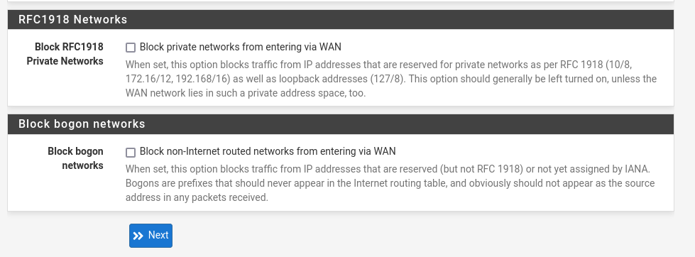 Navigate to the bottom of the page and ensure that the options to unblock RFC1918 private networks and bogon networks are selected. Then, proceed to the next step.