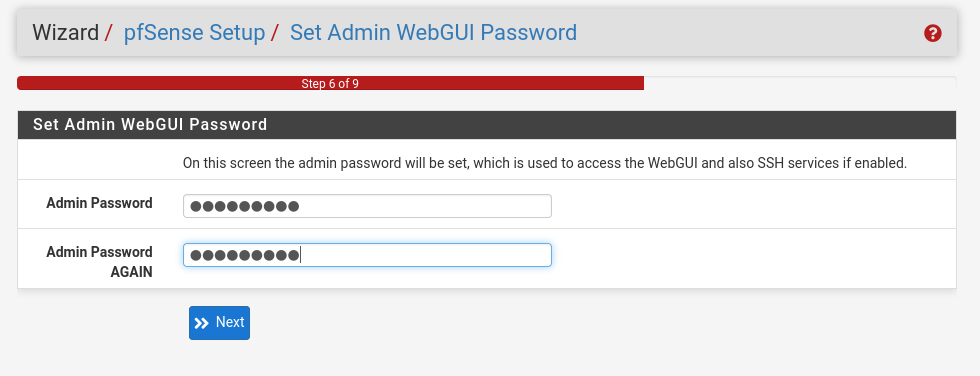Change the admin password to a secure and unique one, then proceed by clicking "Next" to continue with the setup process.