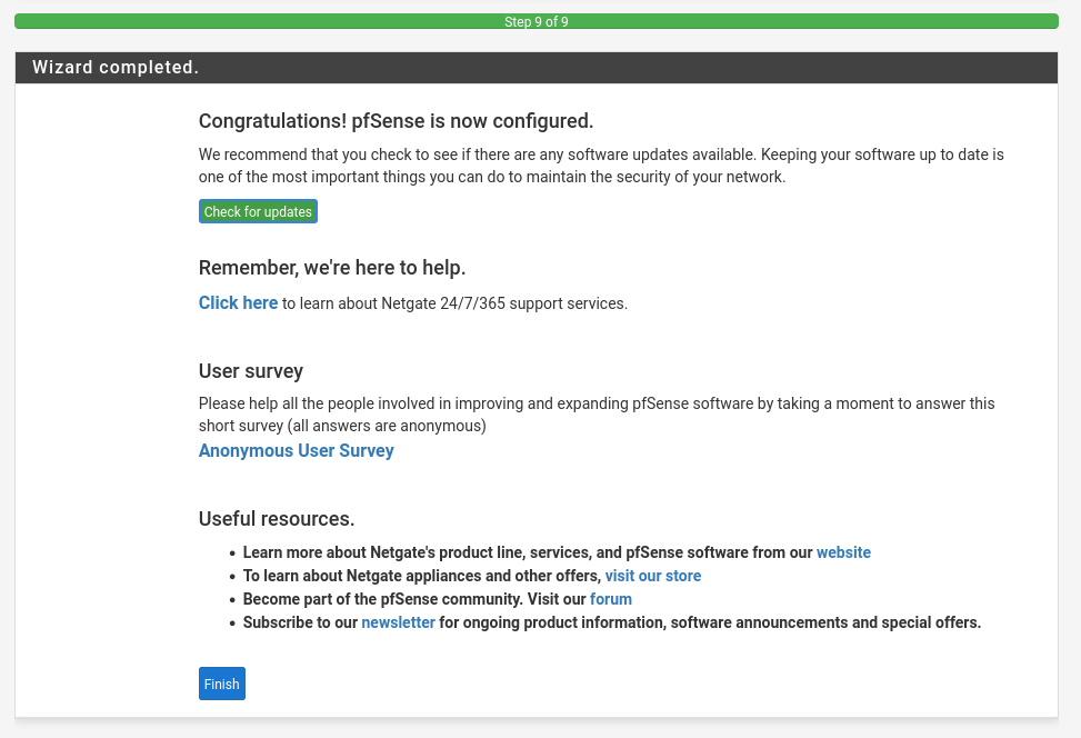 Conclude the setup process by clicking on 'Finish' in the last step. This will finalize the configuration changes you have made in pfSense.