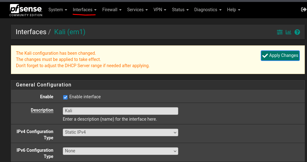 Similarly, follow the procedure to navigate to "Interfaces" and then select "LAN." Change the description to "Kali," save the changes, and click on "Apply Changes" to ensure that your modifications take effect.