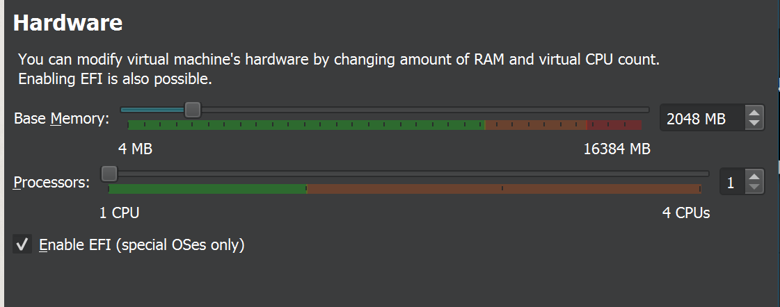 Allocate 2GB (2048 MB) of base memory (RAM) and assign 1 CPU to your home lab and "Enable EFI". Proceed by clicking 'Next' since pfSense is a lightweight operating system.