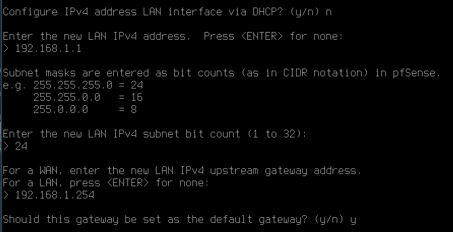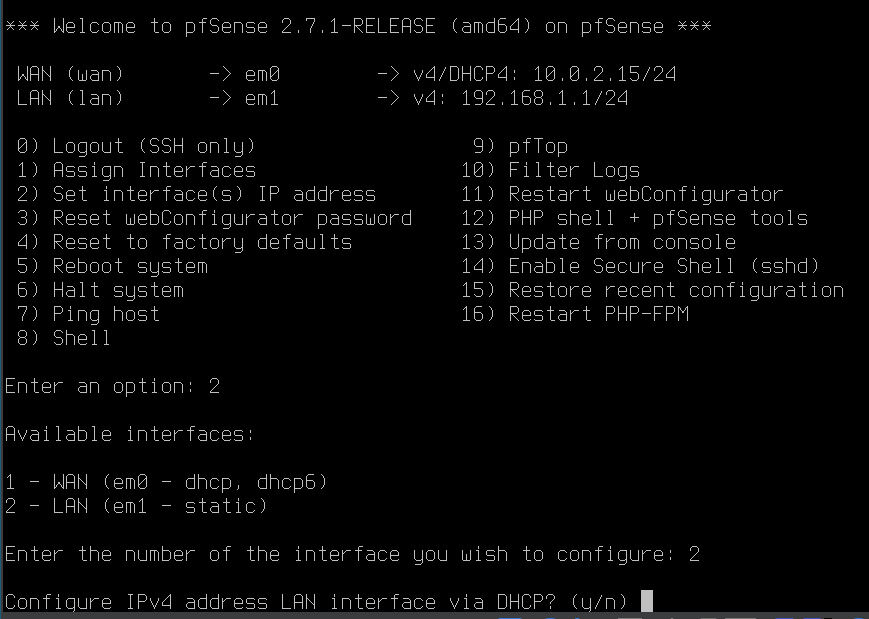Examining the provided screenshot, you can see the available interfaces. To continue configuring the LAN, I proceed by selecting '2' and pressing 'Enter'. I then responded to the last prompt on the above screenshot with 'N' (No), not to configure the LAN interface via DHCP but rather manually.