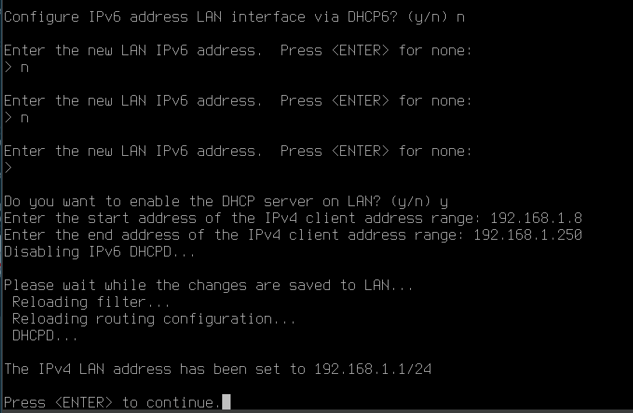 Furthermore, I opted not to configure IPv6, responding 'n' (NO) to all prompts related to IPv6 settings. I simply set the range of IP addresses to be allocated by the DHCP server and proceeded by pressing 'Enter' to end the process.
