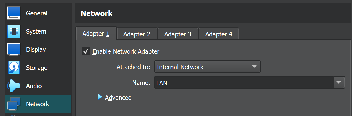 Choose 'Network' and switch 'Adapter 1' to be attached to the internal network, naming it 'LAN.' Click 'OK' to connect to the network.