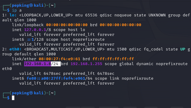 I initiate my Kali machine, log in, and verify the dynamic IP allocated within the range we configured in pfSense.