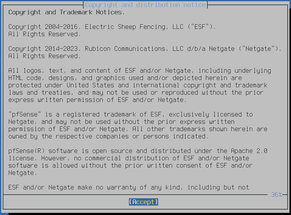 Carefully review the copyright and policy information, ensuring that you commit to using pfSense responsibly and within legal boundaries. If in agreement, proceed to accept the terms.