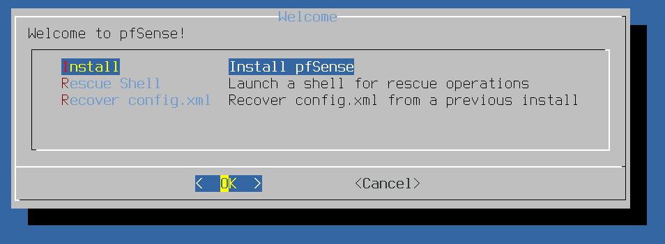 Click 'OK' and Double-click on pfSense or click 'Start' to initiate the installation process through the wizard.