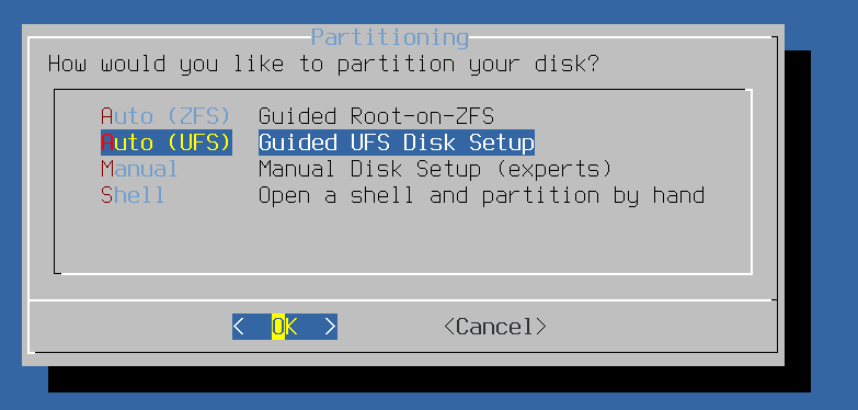 A new dialog box will emerge, prompting you to select a partitioning option such as ZFS, UFS, Manual, or Shell.