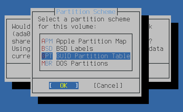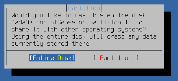 After selecting 'Entire Disk' and pressing Enter, a new prompt will emerge, prompting you to choose a partition scheme. The optimal selection here depends on the specifications of your host machine.